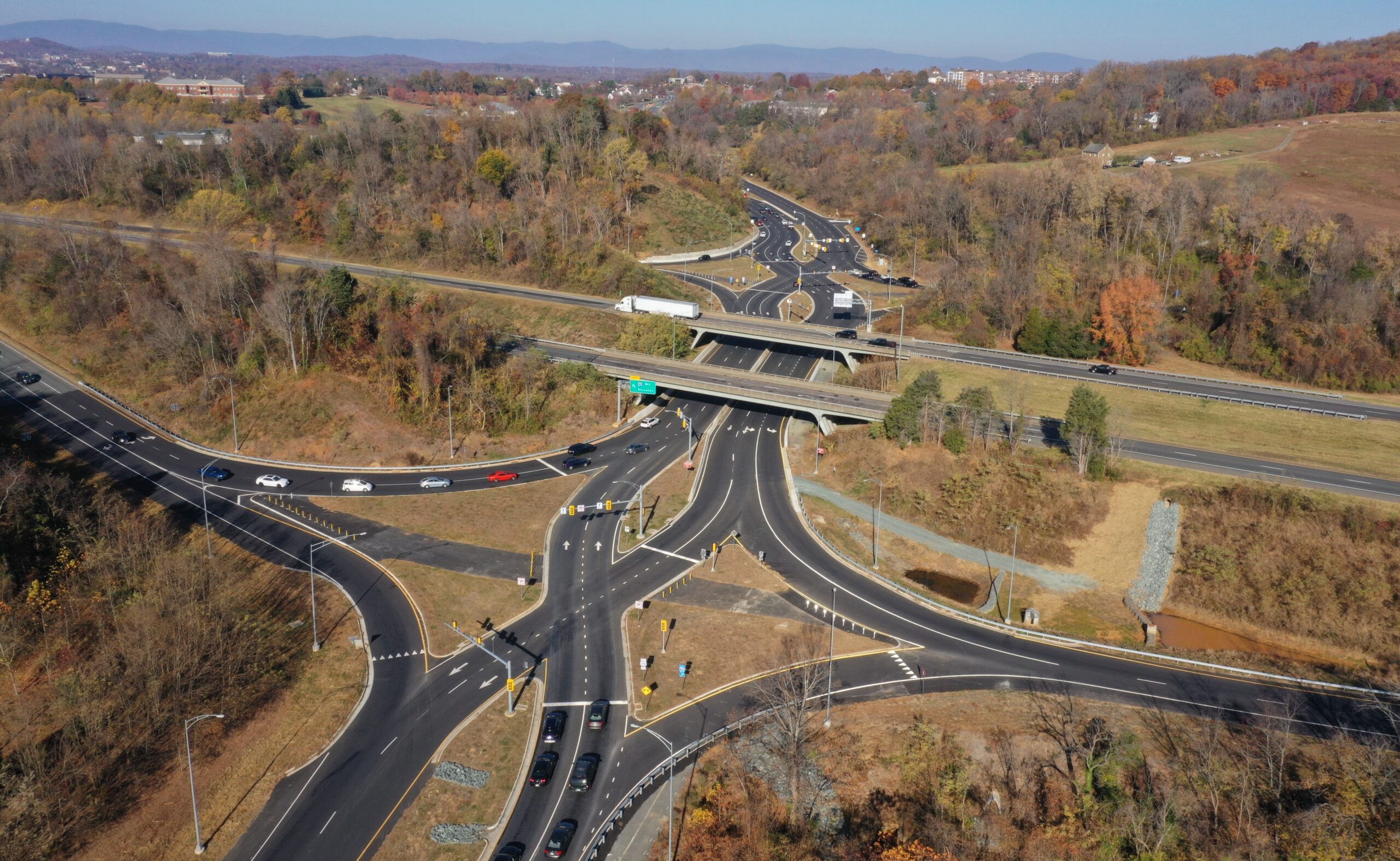 For the I-64/US 250 (Exit 124) Interchange DDI element, modified the existing conventional diamond interchange into a Diverging Diamond Interchange (DDI), with a strong emphasis on traffic control operations and design implementation. The team developed a detailed Maintenance of Traffic plan centered on a carefully sequenced switch-over process to transition traffic safely and seamlessly into the DDI’s counterflow pattern. A step-by-step switch-over narrative guided staging, temporary traffic control, signal integration, signing, pavement markings and lighting, minimizing confusion and maintaining operations throughout construction. On-site traffic engineering support was provided during the nighttime phasing to assist with field layout, real-time coordination, and final traffic shifts.