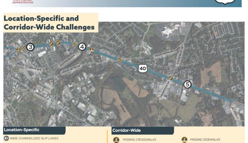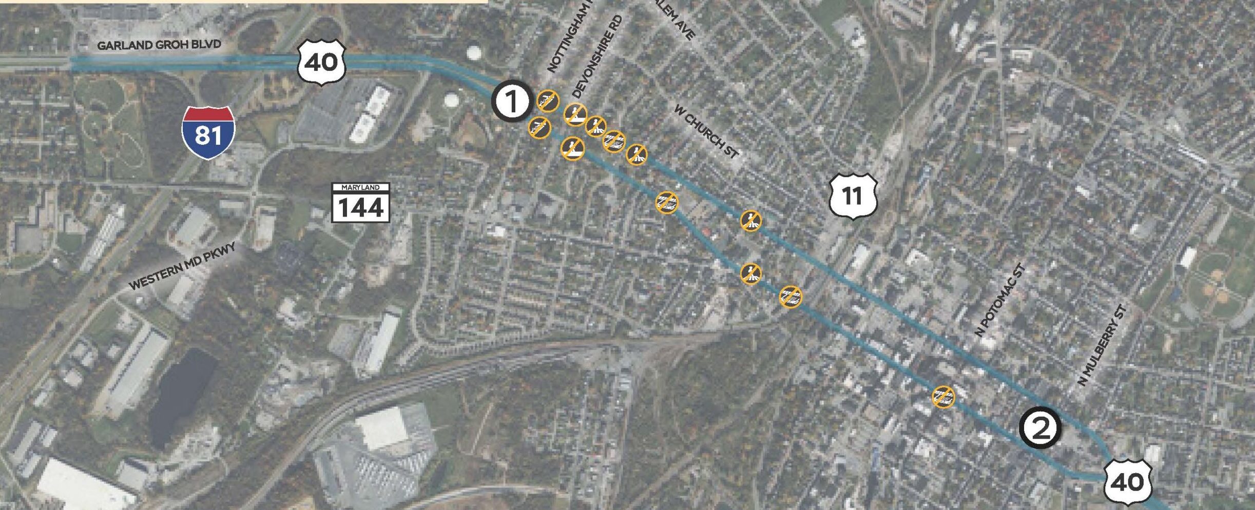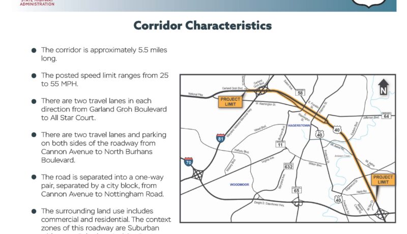 Developed a Pedestrian Safety Action Plan (PSAP) along the US 40 corridor from Garland Groh Boulevard to All-Star Court. Used a data and context driven approach to identify improvements to enhance safety for all users, especially pedestrians, bicyclists, and other vulnerable road users. Work included reviewing traffic data, prior State Highway Administration (SHA) Office of Planning and Preliminary Engineering analyses, and validating existing conditions through desktop reviews, field visits, and peak period and nighttime observations. Five years of crash data were analyzed to identify multimodal safety trends and develop vehicular and pedestrian crash heat maps. The study assessed pedestrian and bicycle comfort using established SHA and national methodologies, evaluated multimodal operations at more than 35 intersections, and developed traffic simulation models to test future conditions. Collaboration with SHA, the City of Hagerstown, the Hagerstown/Eastern Panhandle MPO, and Washington County supported a roadway safety audit, identification of corridor needs, and development of conceptual safety improvements with cost estimates, culminating in a draft action plan prioritizing feasible, implementable solutions.